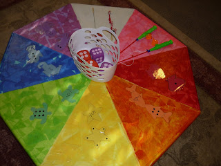 So that brings us to today. The children excitedly noted that the sea creatures did change - they got smaller, changing back to their original size. We re-discussed the ice cube trays and how water could change into a solid (ice) or back to water or even evaporate into the air (gas). During our movement time, we practiced being molecules. As a solid we huddled so close we couldn't move. As a liquid we held hands in a circle and moved a little bit together changing shape ever so slightly. Then we warmed up and broke apart and ran throughout the grass taking up lots of space like a gas molecule. We repeated this a few times since water has "reversible" change.